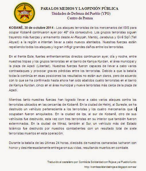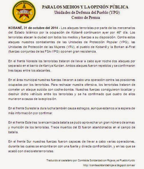 Comunicado del centro de prensa de las YPG [31/10/14]