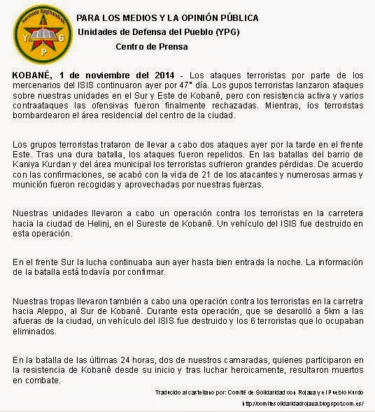 Aquí dejamos los comunicados del centro de prensa de YPG desde el 30 de Octubre hasta el 5 de Noviembre. Gracias al Comité de Solidaridad con Rojava y el Pueblo Kurdo por las traducciones al castellano.Comunicado del centro de prensa de las YPG [30/10/14]
