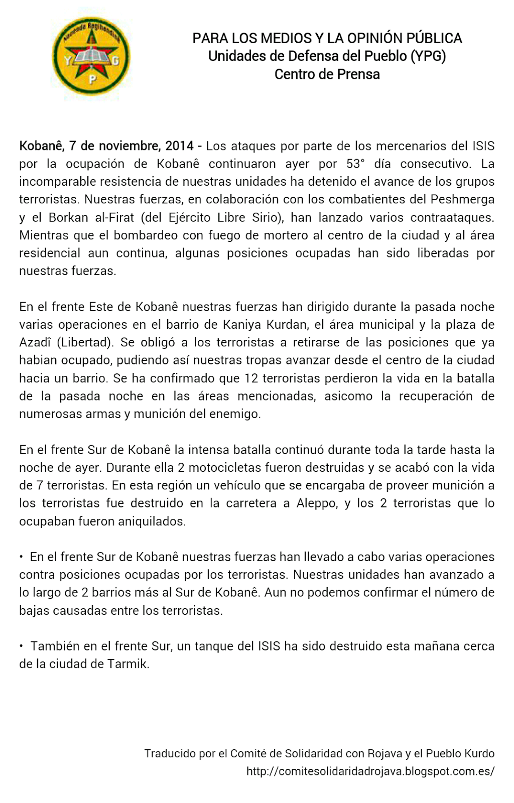 Comunicado 7 de Noviembre del centro de prensa de YPG
